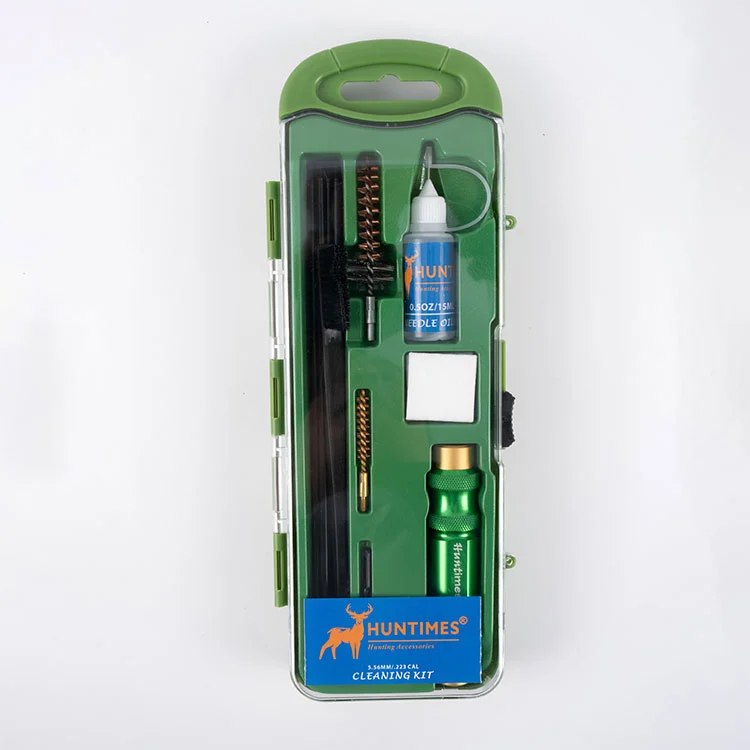 Tässä Shanghai Hunting Speed Industry & Trade Co, Ltd:n 5,56 mm:n 223 kaliiperin aseiden puhdistussarjassa on tukeva alumiinikahva ja se on valmistettu kestävästä alumiiniseoksesta. Se sisältää neljä terästä puhdistustankoa, tähtikammioharjan 5,56 mm luodeille, kammioharjan 0,223 kaliiperille, paikannuksen ulosvetäjän .223 kaliiperille ja 15 ml:n tyhjän öljypullon. Lisävarusteiden mukana tulee myös puhdistusnailonharja, 25 puhdistuslaastaria ja ylellinen alumiinikahva. Tämä sarja sopii täydellisesti AR-aseiden metsästystarvikkeiden puhdistustarpeisiin.